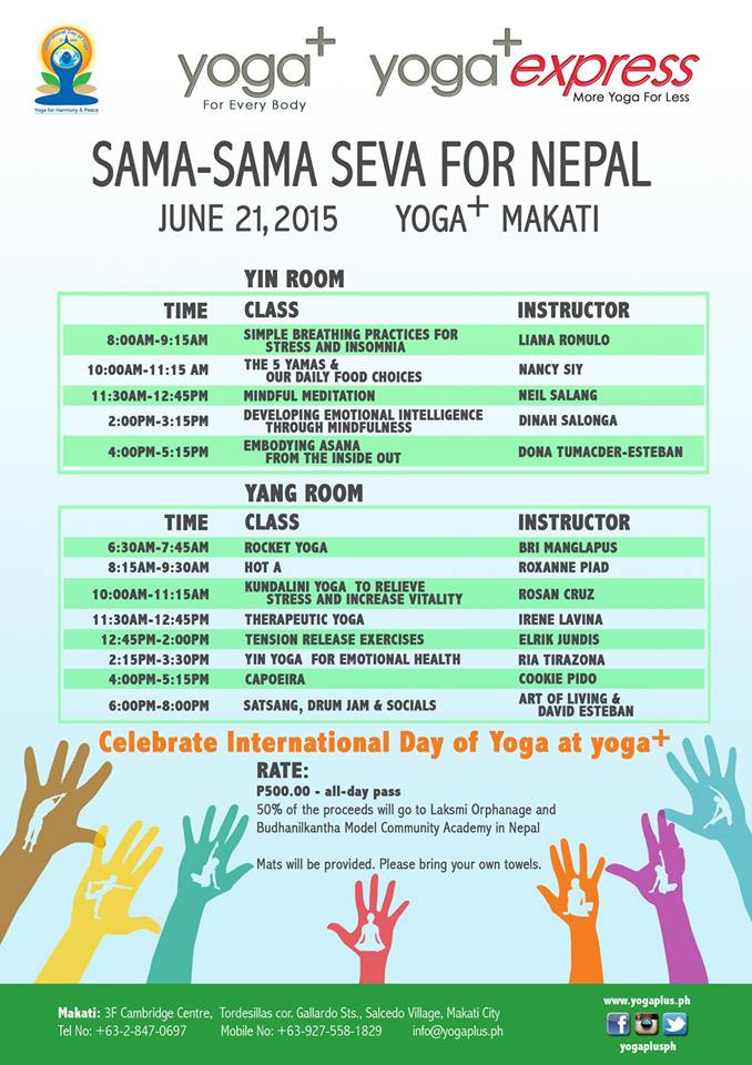 On this special #YogaDay, yoga+ will open its doors to the public at Tordesillas, Makati for a “Sama-Sama Seva for Nepal” event. A full-day of yoga classes, meditation and talks from 6:30am to 8:00 pm.