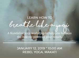 The 2-hour workshop is from 10:00 to 12:00 noon on January 12, 2019 and will be held at Rebel Yoga Manila 6/F Jose Cojuangco Bldg., 119 Dela Rosa St. corner Castro St., Legazpi Village, Makati. For inquiries, SMS (0918) 888-9198.