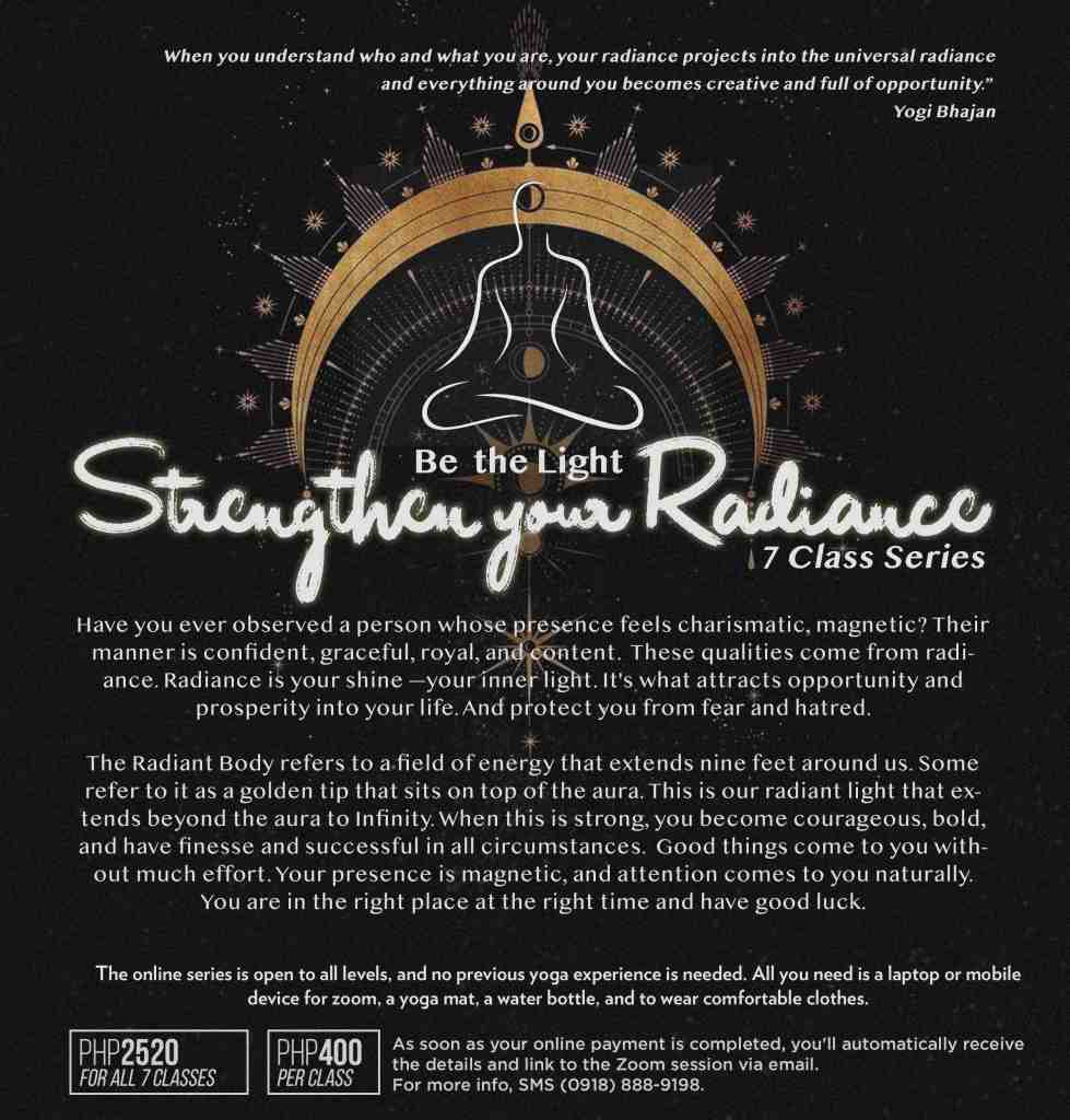 The energy exchange is P400 per class or P2,520 for all seven classes. As soon as your payment is completed, you’ll automatically receive the details and link to the Zoom session via email.